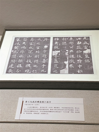 保藏在广州国家版本馆“中华版本概览”展区的这则碑文,记述的是九成宫的来历和其建筑的雄伟壮观,歌颂了唐太宗的武功文治和节俭精神,介绍了宫城内发现醴泉的经过。该展区内的珍贵典藏,以中华版本形态嬗递之序,既展示了中华版本的演变历史,同时也彰显中华文化的独特魅力。